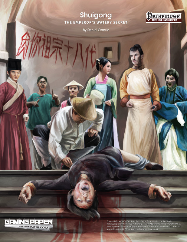 Shuigong is an adventure written by Daniel Comrie, maps by Christopher West, and with stunning artwork by Marco Morte. This adventure is compatible with the Pathfinder Roleplaying Game.