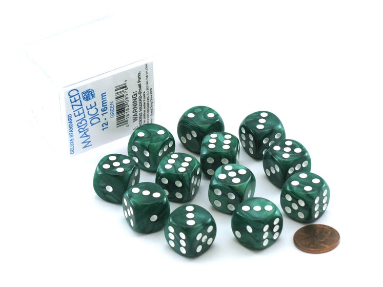 Ces 12 dés marbrés de luxe sont numérotés de un à six, avec des points traditionnels gravés sur les côtés et peints en blanc. Mesurant 16 mm de haut, ces dés sont de taille standard. Les dés ont des bords lisses et arrondis, ainsi qu'un aspect et une texture marbrés de haute qualité. Idéals pour tout jeu de dés. L'ensemble comprend 12 dés dans un étui en plastique transparent.