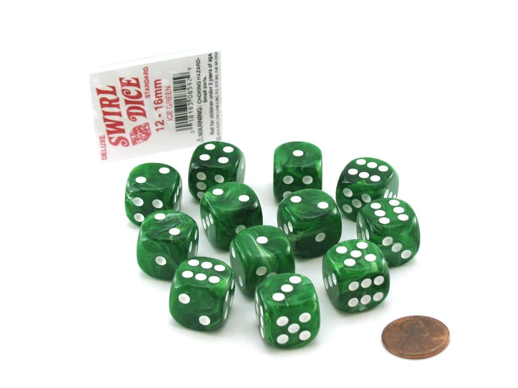 Ces 12 dés 'Swirl' de luxe sont numérotés de un à six, avec des points traditionnels gravés sur les faces et peints en noir. Mesurant 16 mm de hauteur, ces dés sont considérés comme de taille standard. Ils présentent des bords lisses et arrondis, ainsi qu'un effet tourbillonné de haute qualité. Idéals pour tous les jeux de dés. L'ensemble comprend 12 dés dans un étui en plastique transparent.