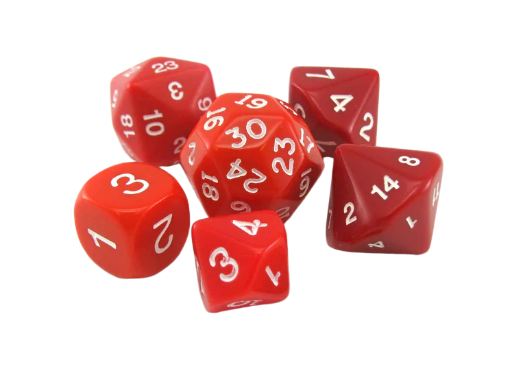 Qui savait que les ensembles de dés opaques vous offraient une variété de dés en un seul achat ? Cet ensemble comprend six dés, y compris un D3, un D5, un D7, un D16, un D24 et un D30. Cet ensemble de dés de couleur unie est agréable à tenir en main et amusant à lancer ! Les chiffres 6 et 9 ont des décimales dans le coin inférieur droit de leurs faces respectives pour aider à les différencier.