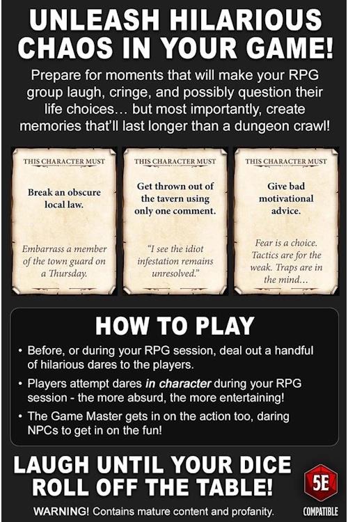 Expect unexpected challenges, hilarious outcomes, and more than a few facepalm-worthy moments. Whether you're playing a serious, high-stakes campaign or just want a break from intense combat, Dumb Dares and Silly Side Quests will inject your game with a dose of lighthearted humor and outlandish roleplaying opportunities. These dares and quests will have everyone in the group laughing out loud and thinking on their feet. While designed with 5E in mind, this game works with virtually any tabletop RPG system. It's great for adding fun side challenges during a long campaign, or for injecting humor into one-shot adventures, providing an easy way to break up the action and spice up your session. No matter how your party members and NPCs respond, the results are bound to be funny, awkward, and downright entertaining. These dares and mini-quests turn the spotlight on character roleplay and improv, making every moment unique and guaranteed to keep the group in hysterics.