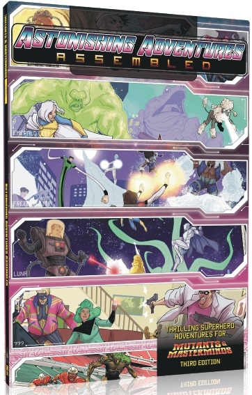 Astonishing Adventures Assembled presents six complete scenarios for the Mutants & Masterminds RPG. In these adventures you can face the icy villains of the Cold Front, tangle with robot dinosaurs, bring order to a city where super pets run amok, escape the whims of a cosmic trickster, and more! Astonishing Adventures Assembled also includes info on fleshing out your world with locations, relationships, and NPCs that can act as contacts, love interests, or rivals. Each adventure stands alone but there’s also advice on connecting them into a campaign and adjusting them for unusual groups or different Power Levels. Grab a scenario and you’re ready to go with Astonishing Adventures Assembled!