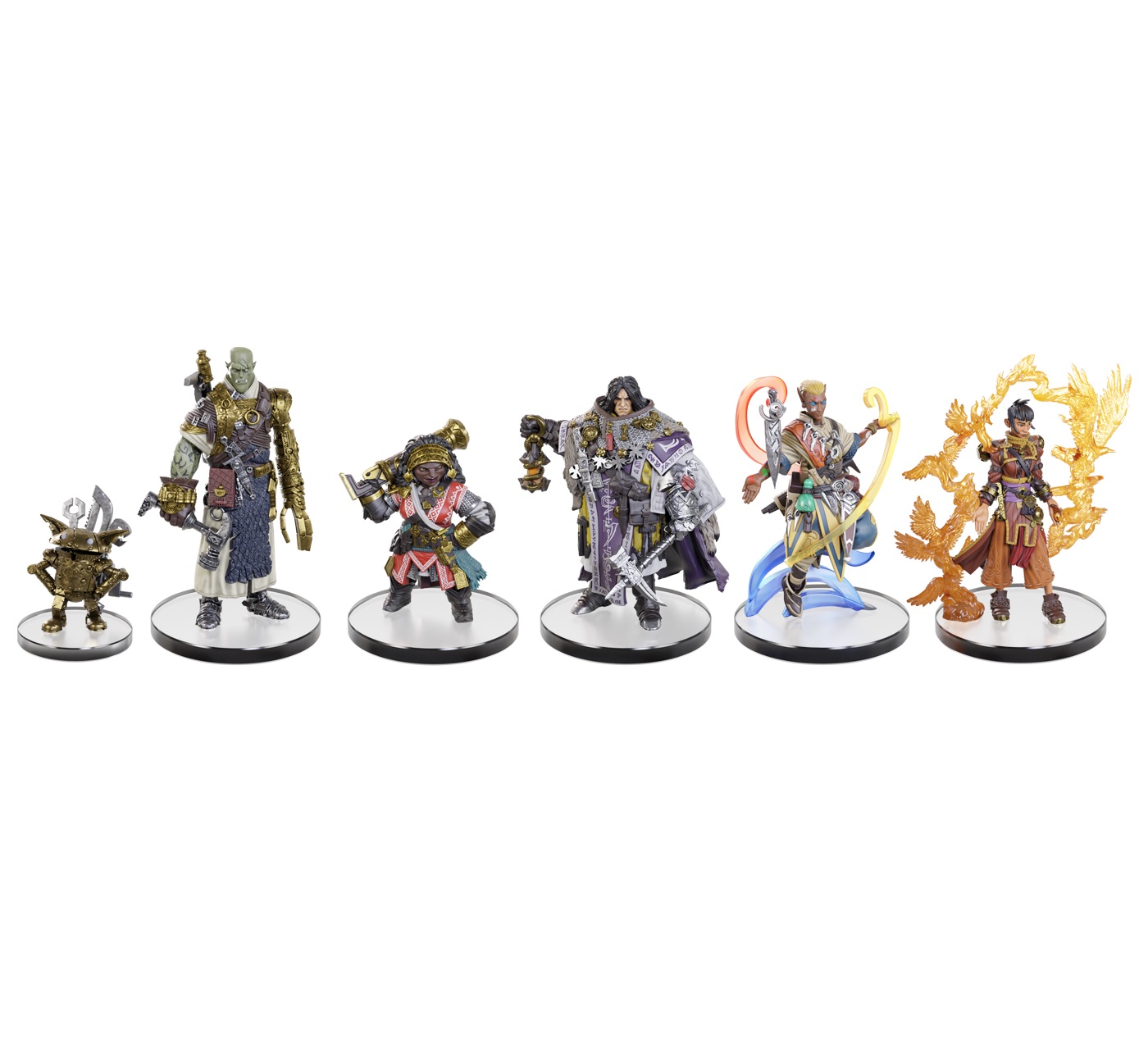 The iconic characters in this set include the half-orc inventor Droven and his clockwork companion Whirp, the human thaumaturge Mios, the dwarf gunslinger Nhalmika, the elf psychic Thaleon, and the human kineticist Yoon.