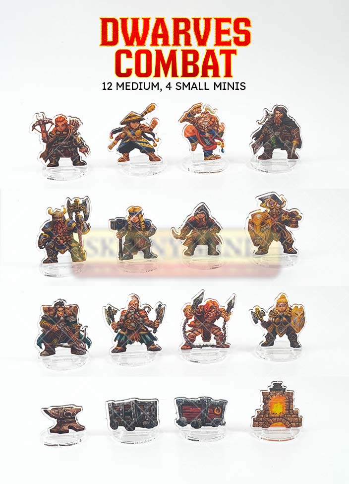 12 Medium Minis Male & Female Barbarians, Fighters, Monks, Paladins, Rangers, and Rogues.  4 Small Minis Anvil, Forge, Mine Carts (2)