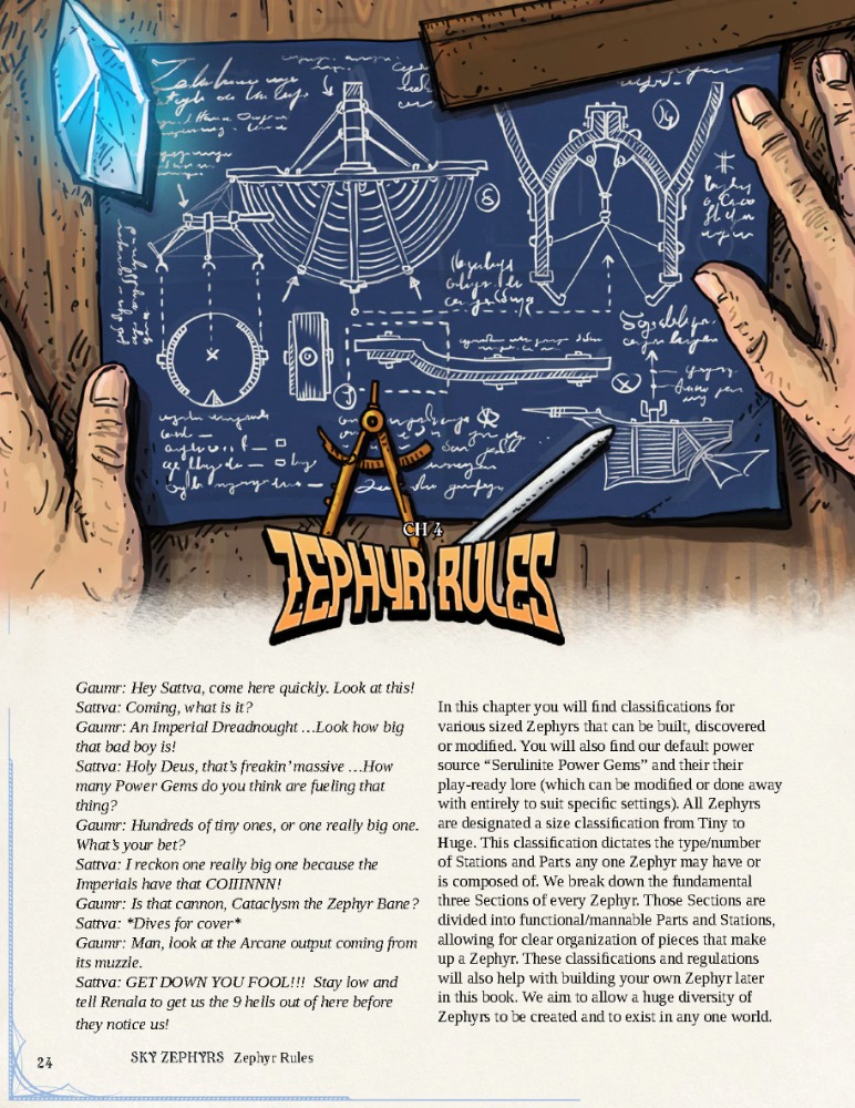 Sky Zephyrs includes a QR code for a one month free subscription to the first ever TTRPG "vehicle builder webpage application." In the builder app, you'll be able to select from over 200 parts to customize your own airships. In the future, we'll expand the app for you to create other types of custom vehicles.
