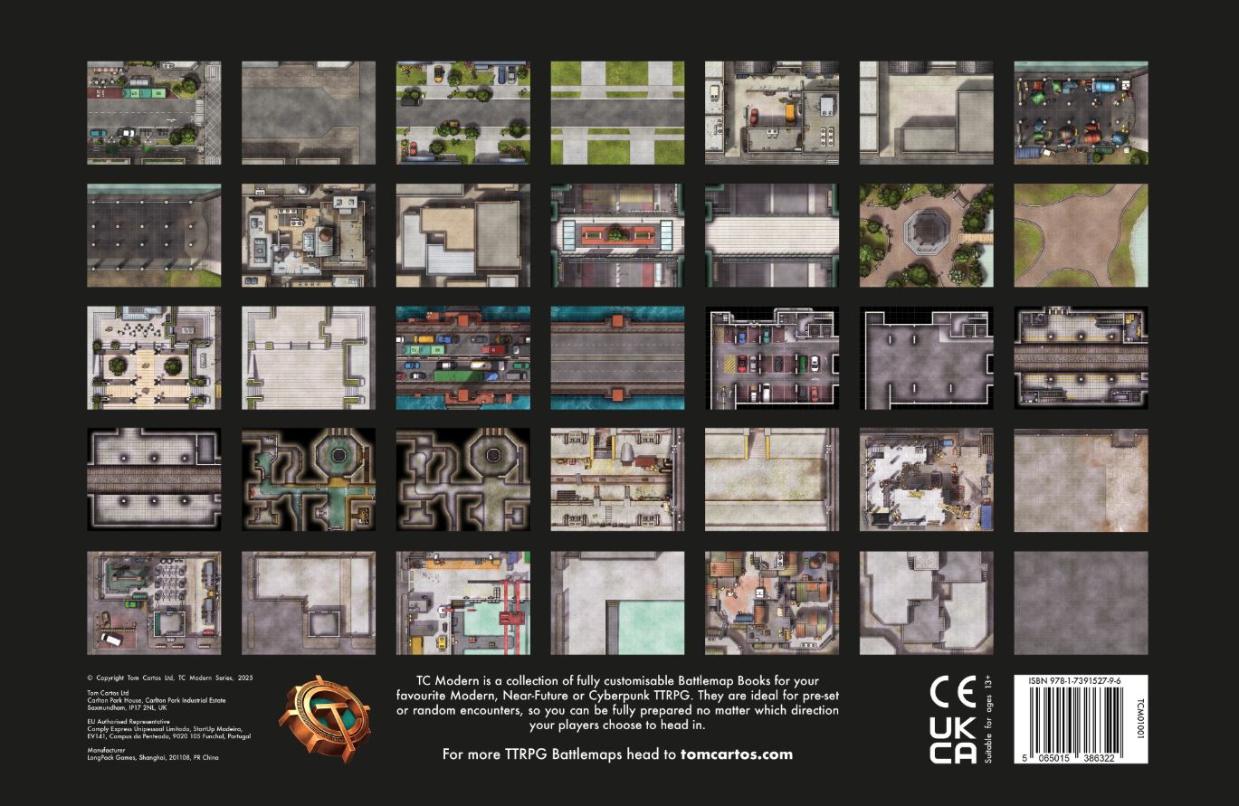 TC Modern is a set of fully customizable Battlemap Books for your favourite Modern, Near Future or Cyberpunk TTRPG. The Modern City series comprises of City Streets & City Buildings, providing you with every location you could need for an urban setting. The battlemaps come in two variations, a fully-furnished highly-detailed version with props and assets already placed for an extra level of immersion and story telling, and a second unfurnished version for you to customize however you need with the included re-usable asset stickers or your trusty dry-erase marker.