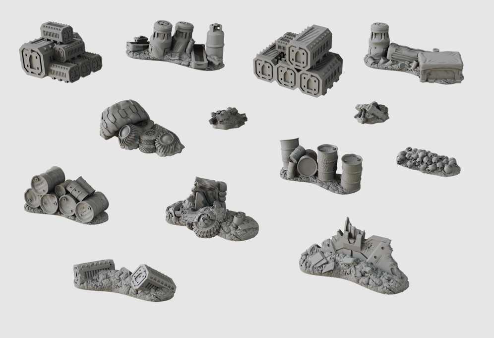 | 13 morceaux de décors pour vos tables de jeux Sci-Fi! Quoique certains morceaux pourrait bien fonctionner sur une table de jeu de type moderne... Les pièces sont de bonne qualité et il n'y a presque rien à corriger avant de mettre un apprêt et de la peinture! |