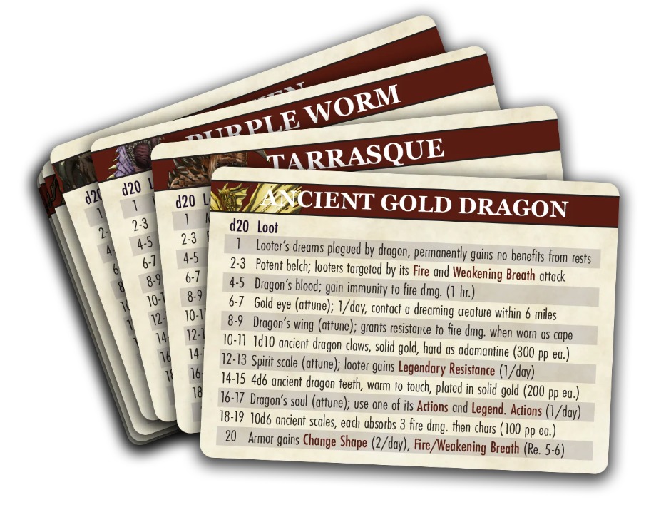 - Dynamic Loot Tables: Rollable d20 tables randomize results and excite players with increasing levels of value with dramatic ‘Nat 20’ and ‘Nat 1’ results.