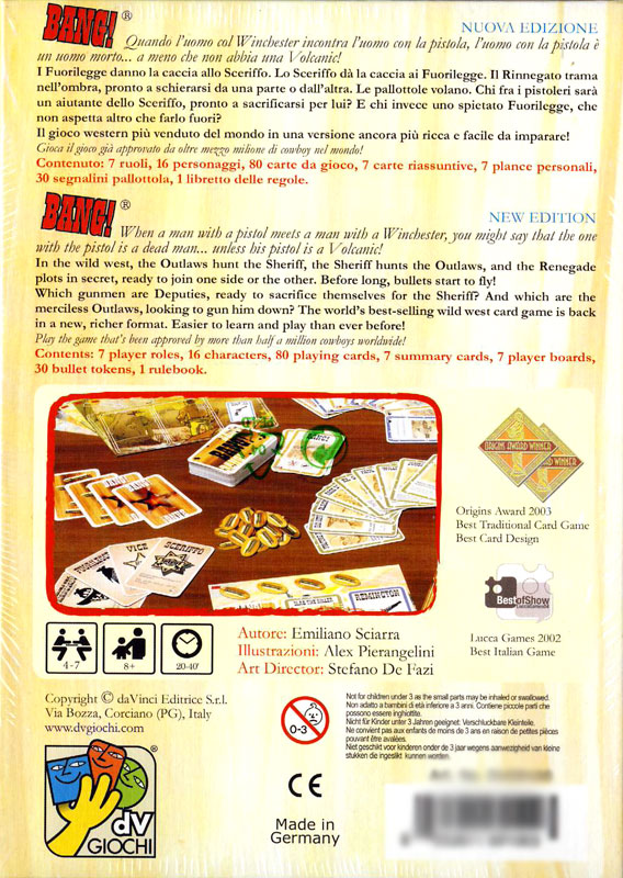 This card game recreates an old-fashioned spaghetti westernshoot-out, with each player randomly receiving a Character card to determine special abilities, and a secret Role card to determine their goal.