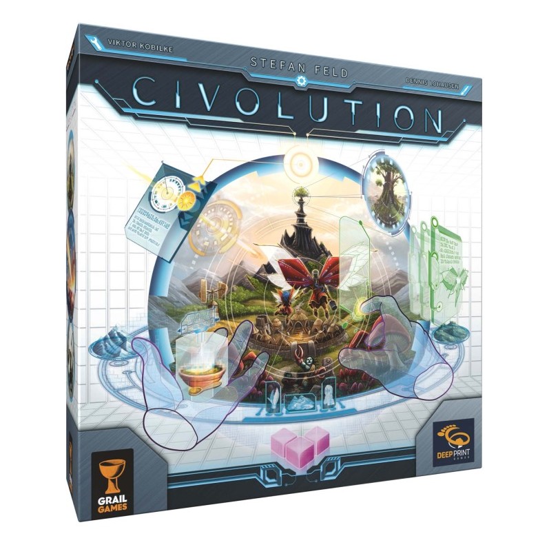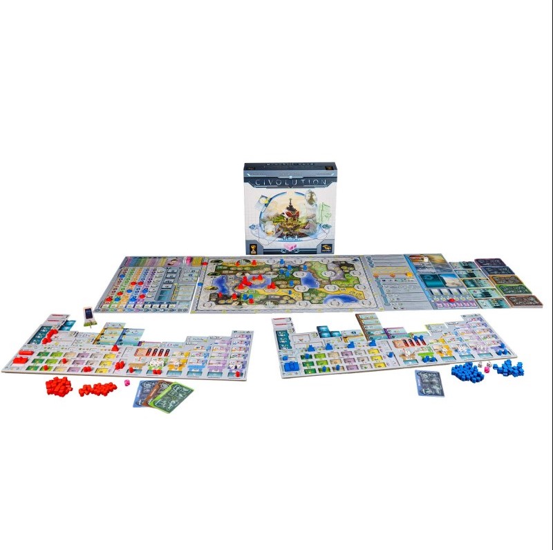 Gérez les innombrables possibilités d'évolution de votre civilisation. "La Faculté Cosmique de l'Académie Technique de Création est ravie de vous accueillir à votre Civolution, l'examen final en Construction de Civilisation ! Pour cette occasion, nous avons préparé une épreuve scénarisée sur un continent isolé. Ici, chacun de vous occupe le rang d'une divinité locale étroitement liée à sa propre civilisation et doit la conduire à la victoire face aux autres civilisations. Vos possibilités de développement sont infinies et vont du progrès culturel et technique aux adaptations évolutives. Par exemple, qu’est-ce qui, selon vous, serait le plus bénéfique pour vos tribus : inventer la roue ou leur permettre de voler en développant des ailes ? Démontrez votre capacité à utiliser votre console de civilisation et montrez nous à quel point vous pouvez vous adapter aux conditions environnementales changeantes et au léger chaos créationnel. Lorsque l’examen prendra fin après quatre époques, celui qui aura réussi à accumuler le plus de points de réussite réussira non seulement l’examen, mais deviendra également membre à part entière de l’Académie Technique de Création." Civolution est un jeu de style eurogame qui utilise un mécanisme de sélection de dés pour déclencher des actions sur un plateau semblable à un arbre technologique. Au fur et à mesure que vous découvrez comment utiliser au mieux vos dés et mettre vos cartes uniques en jeu, des tonnes de stratégies et de chemins vers la victoire émergent, même si chaque fois que vous jouez, vous n'explorerez qu'une fraction des possibilités offertes par le système du jeu et les nombreuses cartes.