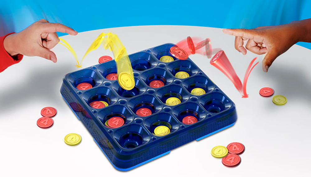 Faire rebondir les disques pour 4 joueurs de suite: c’est le rouge contre le jaune des équipes! Les joueurs font rebondir les disques d’une table vers la grille — en même temps! Faire tomber des disques, voler des points et être le premier à obtenir 4 dans une rangée pour gagner.