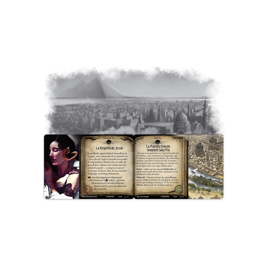| Un scénario secondaire en deux parties. Rendez-vous au Caire pour découvrir pourquoi les gens tombent dans le coma et peut-être les réveiller et stopper la propagation de cette épidémie. Willpower et Agility sont mises à l'épreuve grâce aux cartes de rencontre. Très difficile, ne pas introduire ce scénario dans le milieu d'une campagne en cours. Idéal, par contre, a utiliser en tant qu'épilogue à la fin d'une campagne avec des investigateurs aguerrit. |