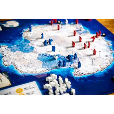 In Meltwater, 2 players command the shattered remains of the superpowers, struggling for control of the ice. Simple diceless mechanics let players displace, corner, and isolate their opponent’s survivors. Here, hunger is a crueler weapon than gunfire, and the barren tundra can only support so many souls. And every turn, radioactive contamination pushes in from the coastline, shrinking the available space and forcing the belligerents closer and closer together.