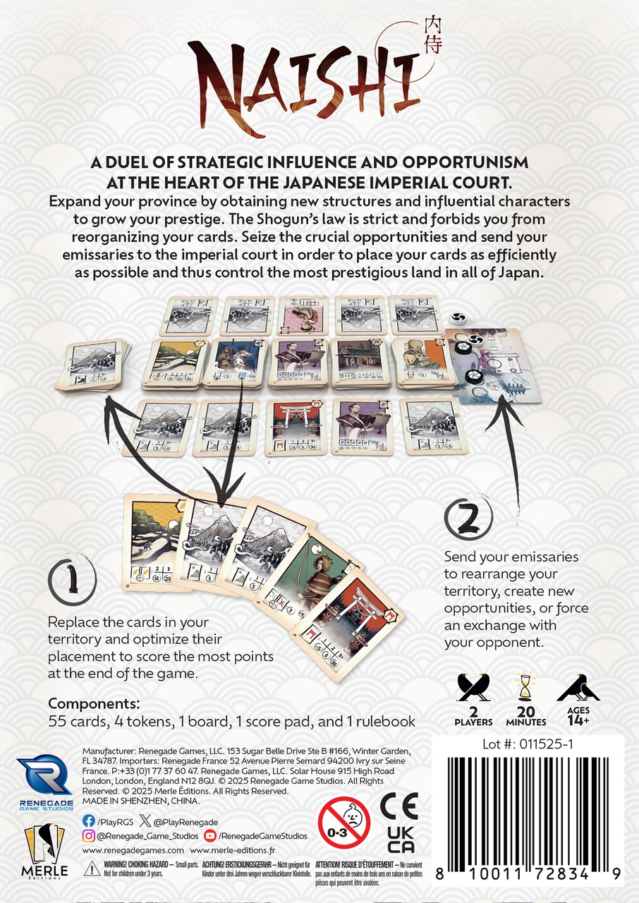 - Place Ninja, Ronin, Torii, Rice Fields and the elusive Naishi to create the highest scoring Imperial Court in Japan.