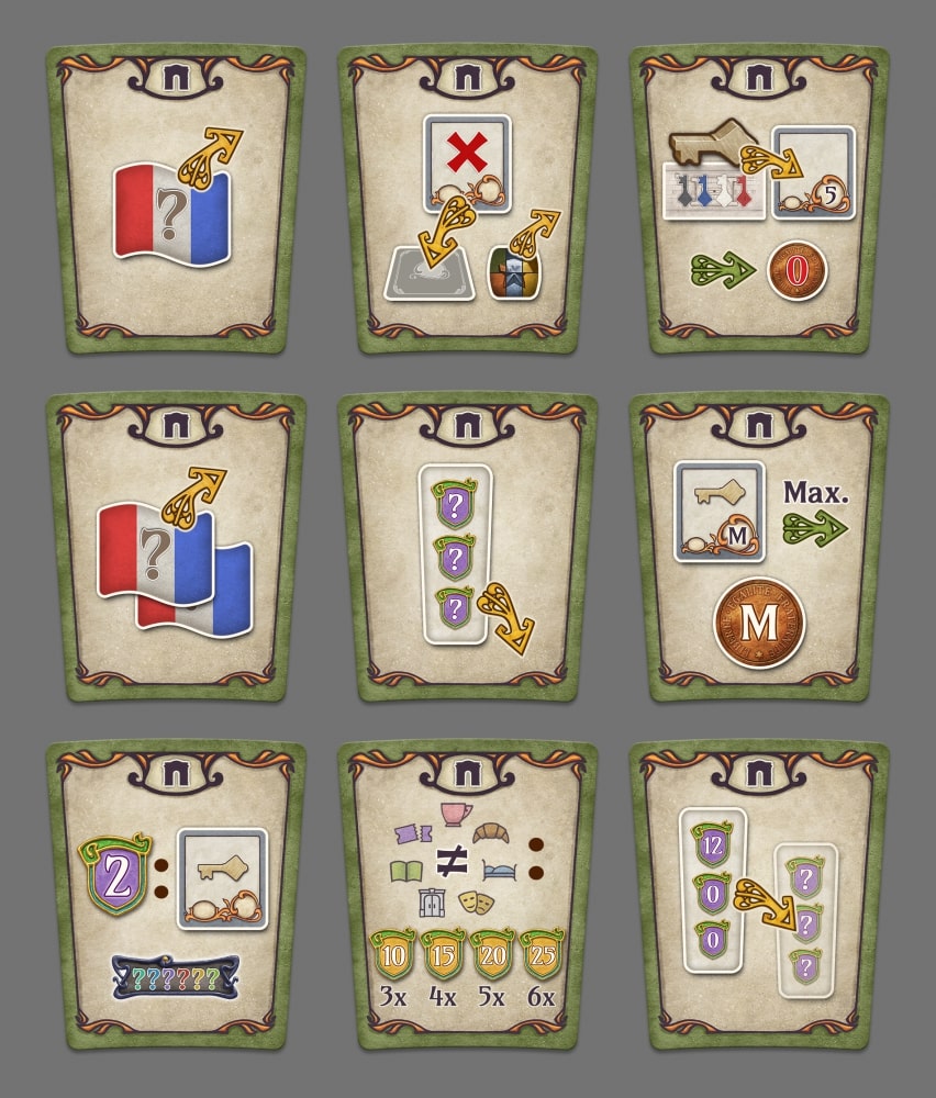 Paris : l'Étoile introduit une nouvelle collection de tuiles bonus, qui ajouteront plus de variété et de rejouabilité à votre jeu de Paris, ainsi que des tuiles de stratégie. Celles-ci donnent à chaque joueur un pouvoir unique, qu'il peut choisir de modifier s'il place une de ses clés sur l'Arc de Triomphe.
