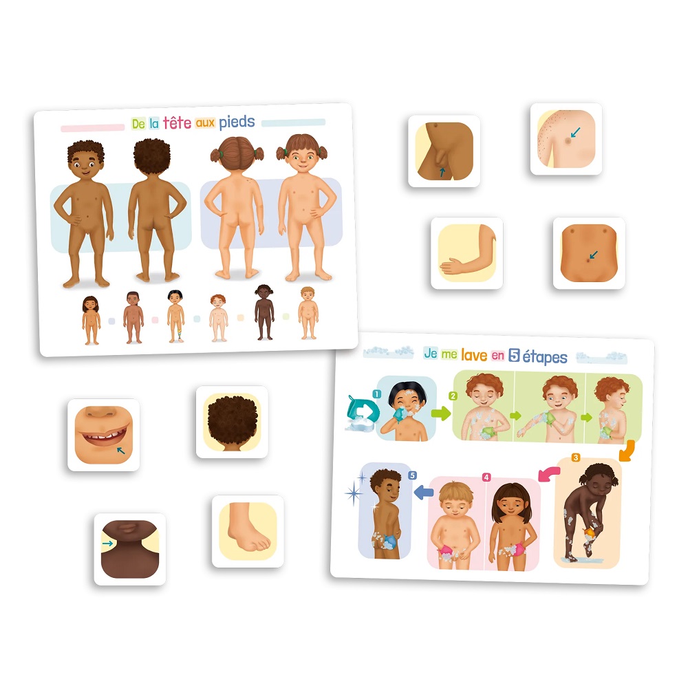 La connaissance des parties du corps contribue à développer une image corporelle positive. Le jeu De la tête aux pieds propose à l'enfant d'explorer jusqu'à 30 parties du corps tout en découvrant la diversité des corps : traits du visage, teints de peau, yeux, cheveux, morphologies différentes et situation de handicap physique.