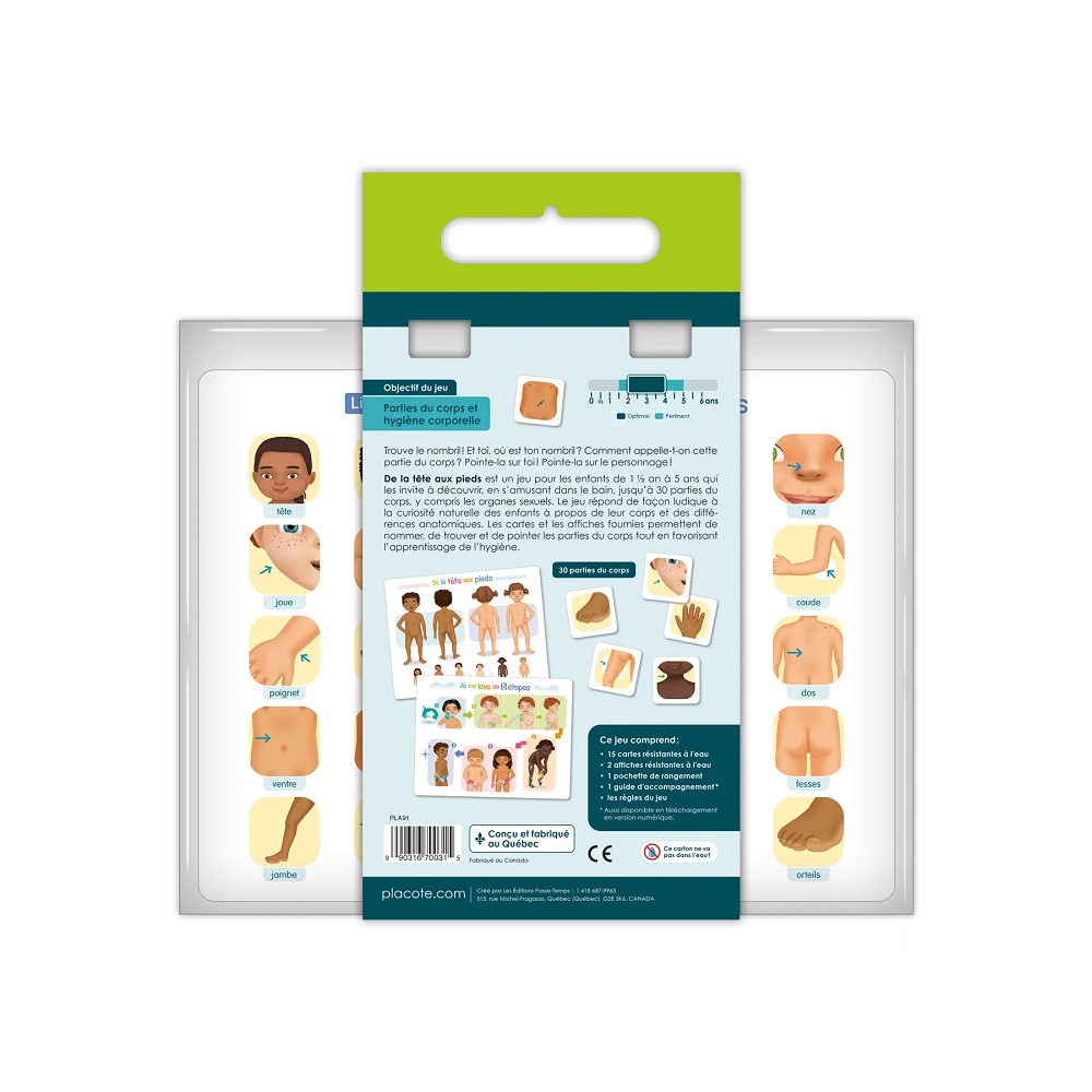 De la tête aux pieds est un jeu pour les enfants de 1½ an à 5 ans qui les invite à découvrir, en s'amusant dans le bain, jusqu'à 30 parties du corps, y compris les organes sexuels. Le jeu répond de façon ludique à la curiosité naturelle des enfants à propos de leur corps et des différences anatomiques. Les cartes et les affiches fournies permettent de nommer, de trouver et de pointer les parties du corps tout en favorisant l'apprentissage de l'hygiène.