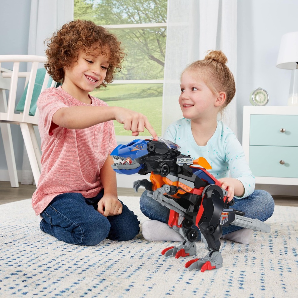 - Transformez vos aventures de jeu avec Switch & Go; combinez facilement le camion de pompiers, l'hélicoptère de sauvetage et la voiture de police électronique pour créer un T-Rex de plus de 20 pouces de long avec des yeux de dino animés.