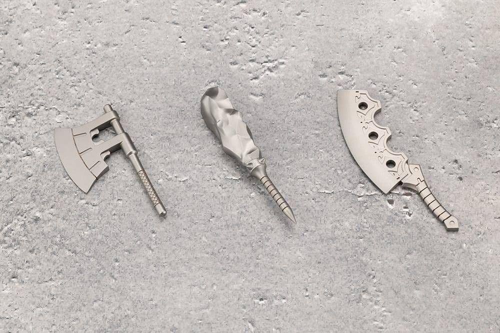 Trois types d’armes sont inclus : une matraque, une hache et une machette. Lorsque plusieurs figurines sont alignées, l’arme peut être changée selon la personnalité attribuée. La hache et la machette peuvent aussi être fixées sur différents points durs grâce aux joints de 3 mm fournis.