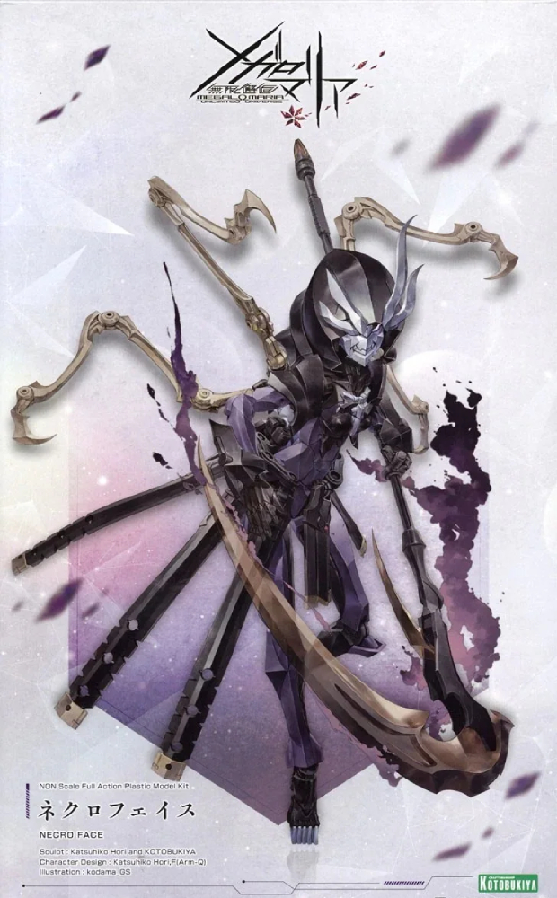 Necro Face est une vilaine emblématique de la série de maquettes « MegaloMaria Unlimited Universe » de Kotobukiya, arborant un motif inspiré de la Faucheuse. Cette version DX est équipée de la faux Curse Reaper et de l’armure Ex-Armor Necromancer.