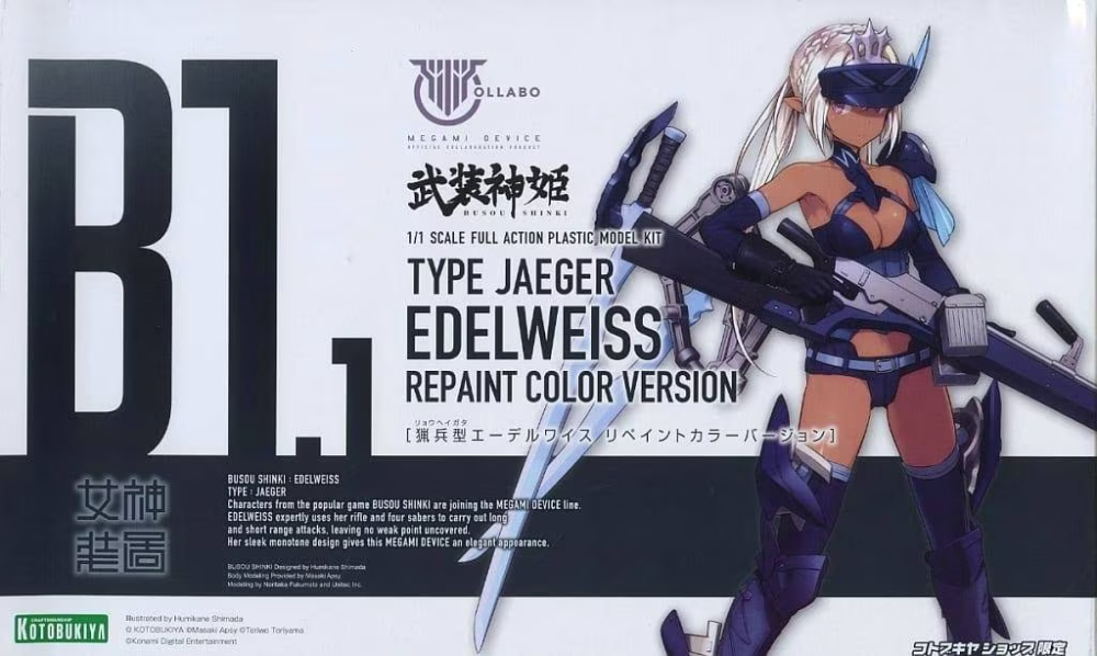 Ce modèle est une version colorée du TYPE JAEGER EDELWEISS original conçu par Humikane Shimada. En contraste avec la palette de couleurs blanche pure de l'Edelweiss normal, Humikane Shimada donne vie à ce kit avec un style presque complètement opposé, utilisant une palette de couleurs plus sombres, incluant des armements de couleur plus foncée et un teint de peau plus sombre.