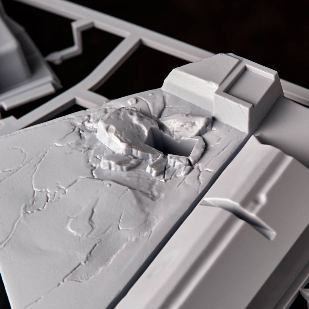 Cette maquette est basée sur une sculpture en résine créée en 1997. Toutes les pièces ont été scannées en 3D et converties en données numériques pour produire cette version. La forme des ailes a été affinée par rapport au prototype original, et la base représentant des gravats a été agrandie pour mieux supporter la silhouette imposante du modèle, tout en ajoutant davantage de détails.