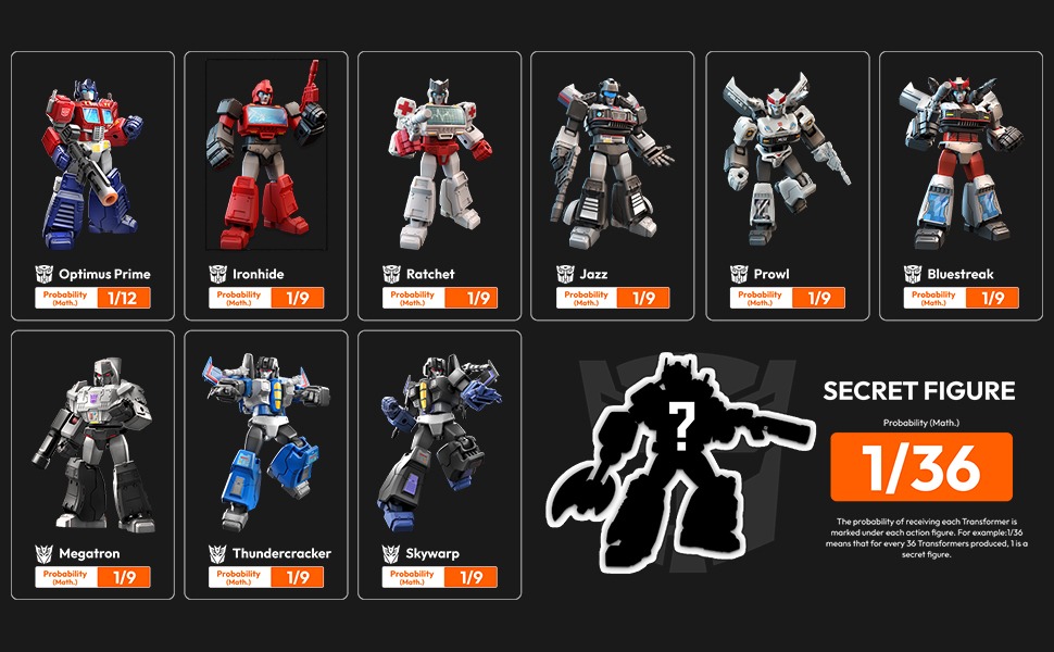 La collection comprend : 9 robots, et 1 figurine “chase” rare.