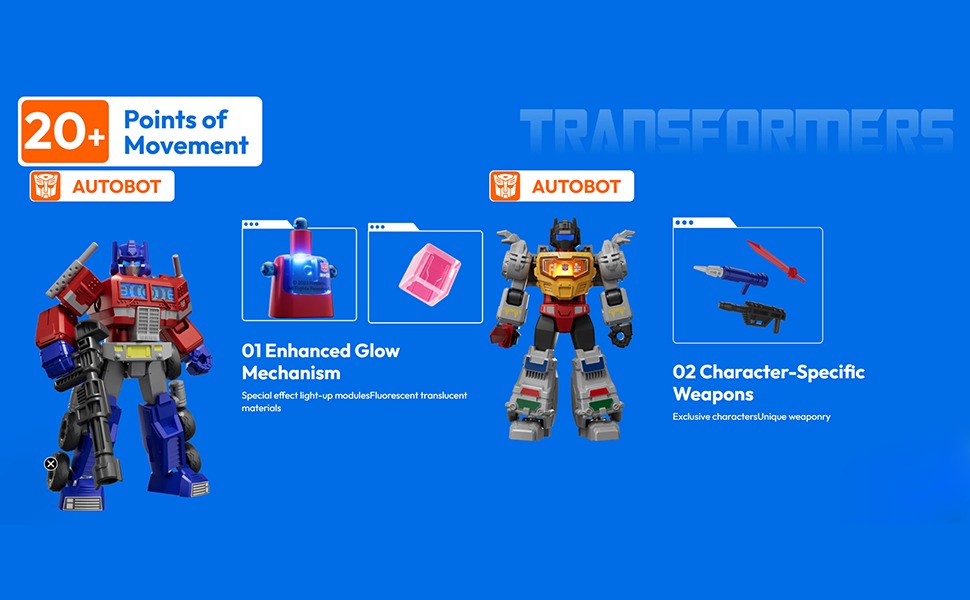Les Blokees Transformers officiels reviennent avec une touche lumineuse ! La Shining Version 03 met à l’honneur les personnages classiques de 1985, désormais dotés d’yeux et de poitrines lumineux. Chaque boîte surprise contient une maquette mystère, incluant la rare version métallique d’Optimus Prime. Avec plus de 20 points d’articulation, ces maquettes sont hautement posables et idéales pour les collectionneurs comme pour les fans de la première heure. Les Autobots et Decepticons de 1985 brillent plus que jamais dans la collection Shining Version 03 !
