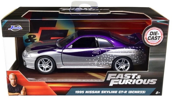 Ajoutez une touche d’élégance à votre collection avec cette superbe voiture de cinéma signée Jada Toys ! La Nissan Skyline GT-R (BCNR33) de 1995 est une réplique à l’échelle 1/32. Présentée en violet, elle dispose de portières ouvrantes et d’un mécanisme à rétrofriction (pull back). C’est une automobile remarquable pour toute collection de voitures de films, et un vrai coup de cœur pour les fans passionnés de Fast & Furious !