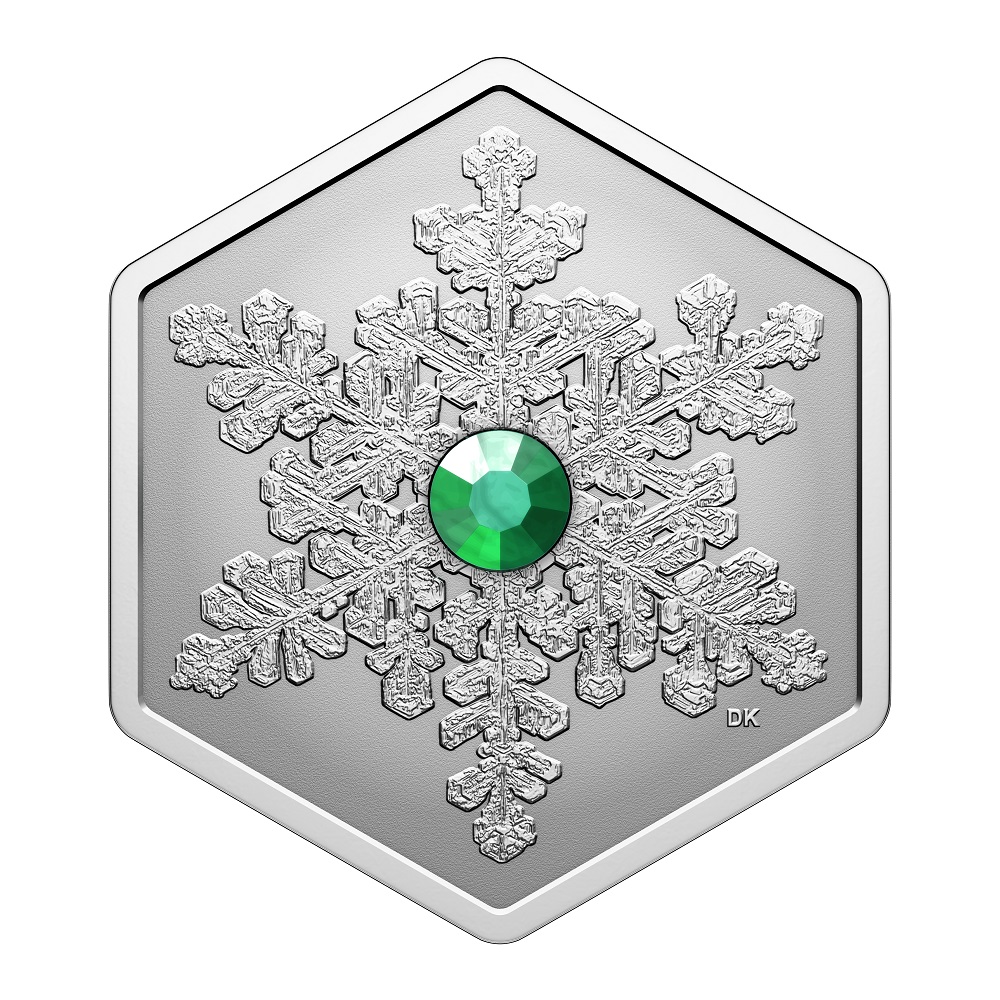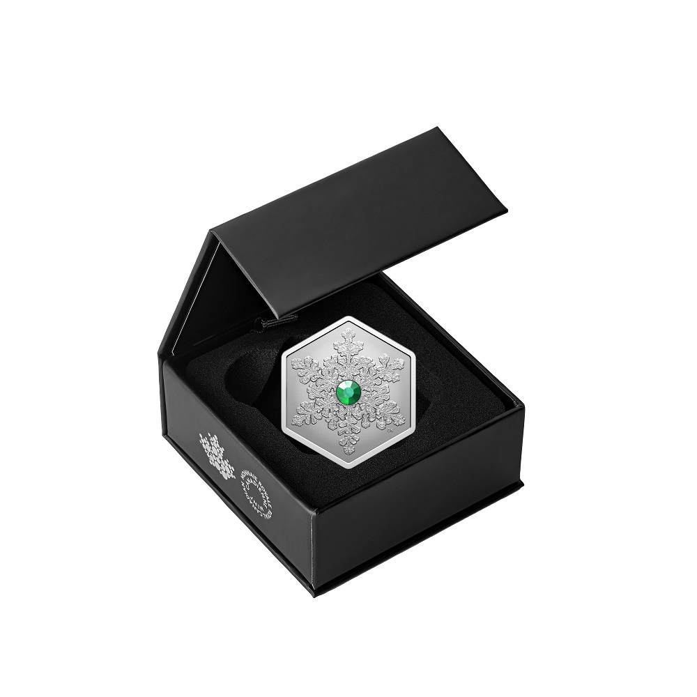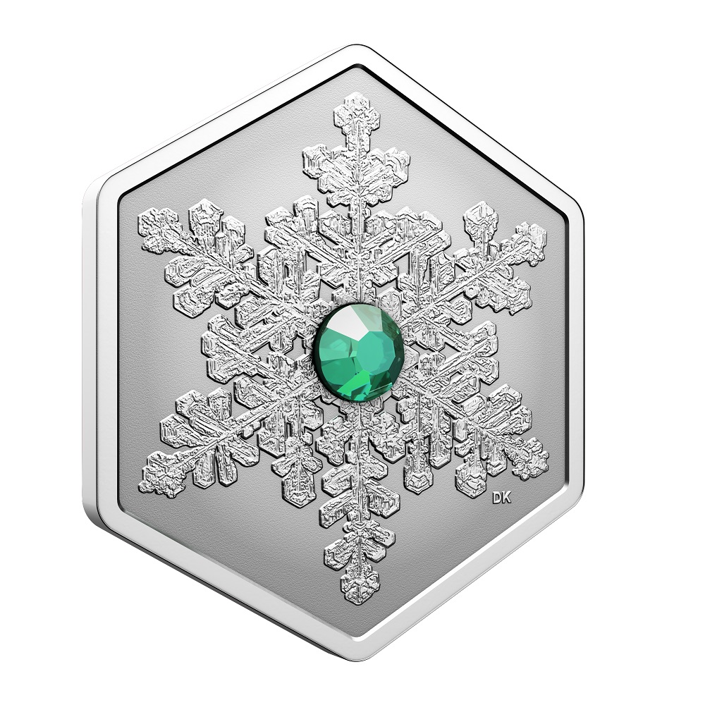 Troisième pièce de la série! La série Flocon de neige de la Monnaie royale canadienne se poursuit avec une nouvelle pièce dont la populaire forme hexagonale épouse parfaitement les six pointes du cristal de neige complexe gravé au revers et rehaussé d’un cristal coloré.