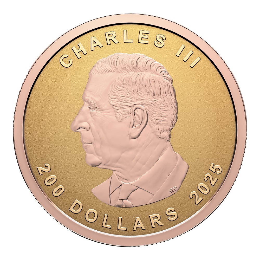 Gage de fierté pour ces panoramas incroyables, le motif récurrent à effet de pulsation « cœur de la forêt » fait un retour en 2025 au revers de cette pièce de 5 oz, vous transportant au beau milieu d’une forêt brumeuse. Il s’agit de la plus imposante (65 mm) de nos pièces Feuille d’érable en argent (FÉA) et Feuille d’érable en or (FÉO) à très haut relief émises en 2025. Les arbres se révèlent et s’estompent derrière la feuille d’érable gravée en très haut relief et rehaussée d’un placage d’or rose, ce dernier se voulant une représentation du rouge, la plus vive des teintes automnales et des couleurs officielles du Canada