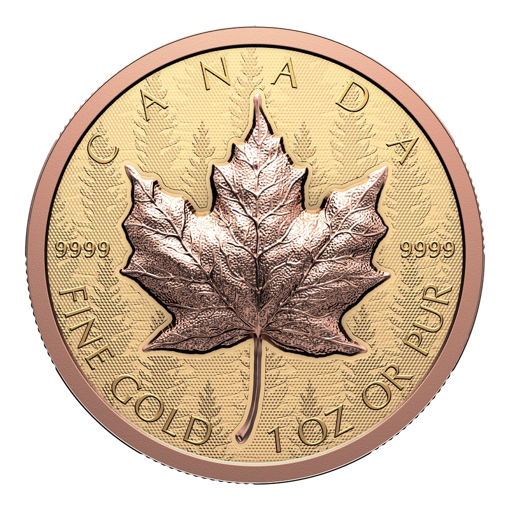 ➢ L’emblématique Feuille d’érable en argent (FÉA) du Canada gravée en très haut relief, entourée d’un motif récurrent de forêt et – nouveauté 2025 – rehaussée d’un placage d’or rose.