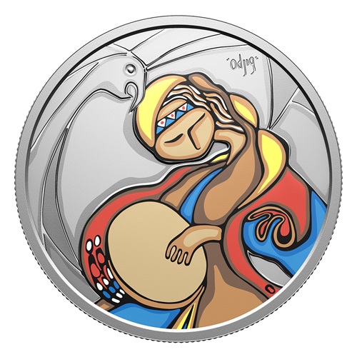 En 2025, Daphne Odjig devient la première femme artiste des Premières Nations à être honorée sur une pièce de circulation canadienne, dont le motif au revers est repris avec de nouveaux détails ici, sur cette pièce en argent pur à 99,99 %. Le diamètre plus grand (38 mm) laisse place à de nouveaux éléments tirés de l’œuvre originale Folk Singer, notamment la puissante représentation d’oiseau, qui ne se retrouve pas sur la pièce de 2 $. La coloration sélective, quant à elle, rend hommage à la palette de couleurs vives de Daphne Odjig et à son style artistique captivant.