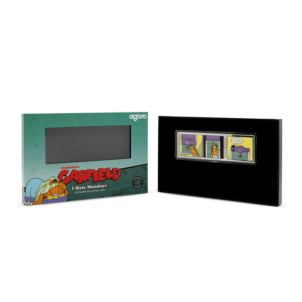 Chaque pièce en argent de 1 oz est frappée en argent pur 999, numérotée individuellement et présentée dans un emballage à thème Garfield avec une marque d’authenticité.