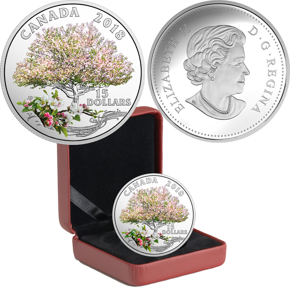 La fleur du pommier, avec ses pétales aux couleurs délicates et son doux parfum, est un magnifique emblème du printemps! La nature est en fleurs sur cette pièce en argent fin dont le revers gravé et coloré met en scène la beauté saisonnière du pommier national du Canada : le McIntosh.