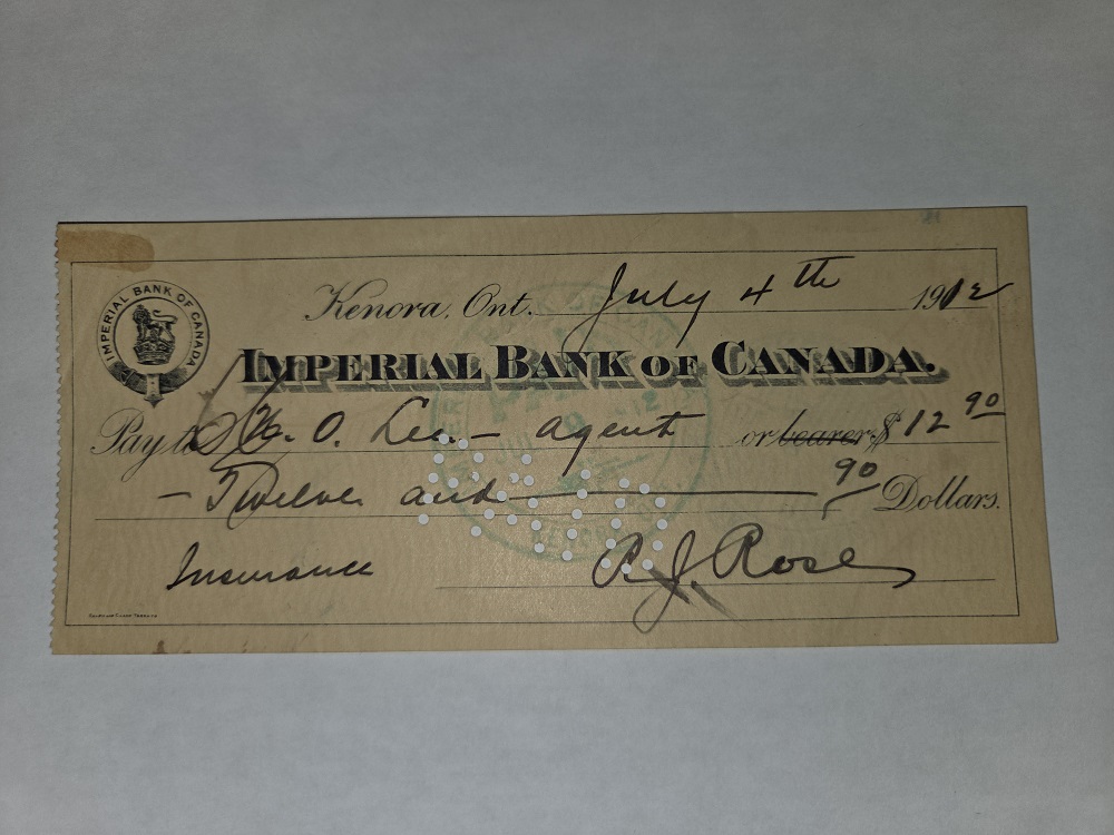 IMPERIAL BANK OF CANADA  -  BILLETS DU CANADA  -  CHÈQUE DE LA IMPERIAL BANK OF CANADA, KENORA
