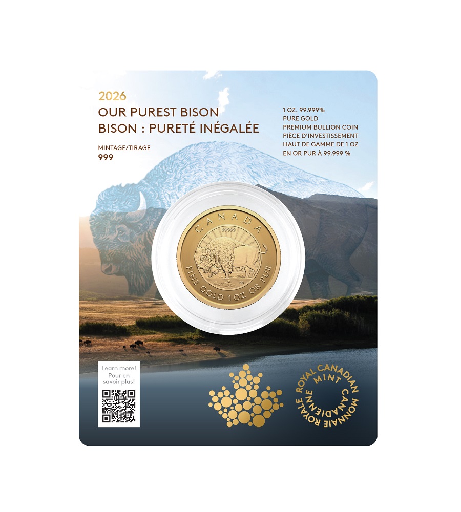 NOUVEAUTÉ! Faite d’or pur à 99,999 %, le plus haut degré de pureté possible pour l’or affiné, la pièce Bison : Pureté inégalée s’inscrit parmi les pièces d’investissement en or les plus pures au monde. Il s’agit de la deuxième pièce d’investissement haut de gamme en or de la Monnaie royale canadienne ayant ce degré de pureté.