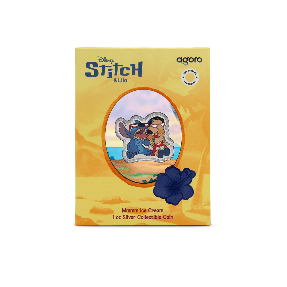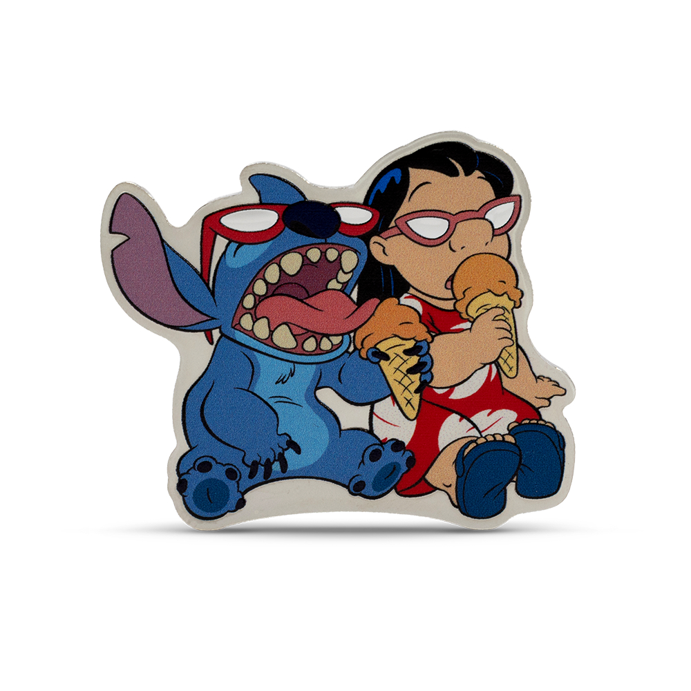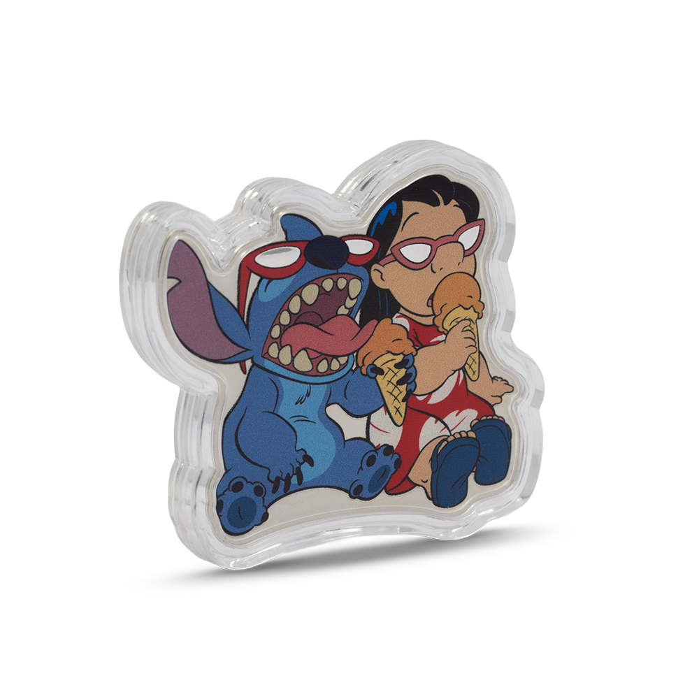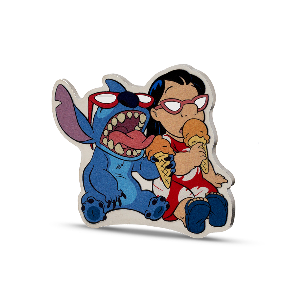 Célébrez l’amitié touchante de Lilo & Stitch de Disney avec cette pièce de collection en argent pur 999 de 1 oz. Deuxième sortie officielle de notre série, elle met en scène le duo inséparable partageant une glace, illustré en couleurs vives et éclatantes. Lilo apparaît calme et posée dans sa robe rouge et ses lunettes de soleil, tandis que Stitch, fidèle à lui-même, savoure sa glace avec une énergie débordante.