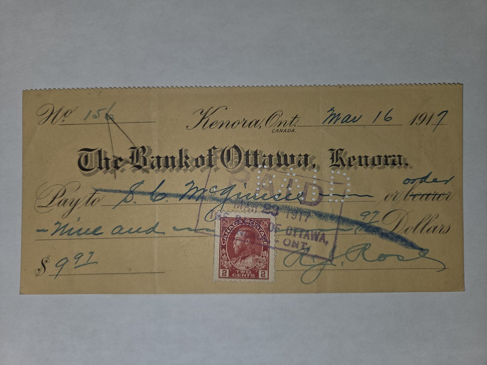 THE BANK OF OTTAWA - BILLETS DU CANADA - CHÈQUE DE LA BANK OF OTTAWA, KENORA