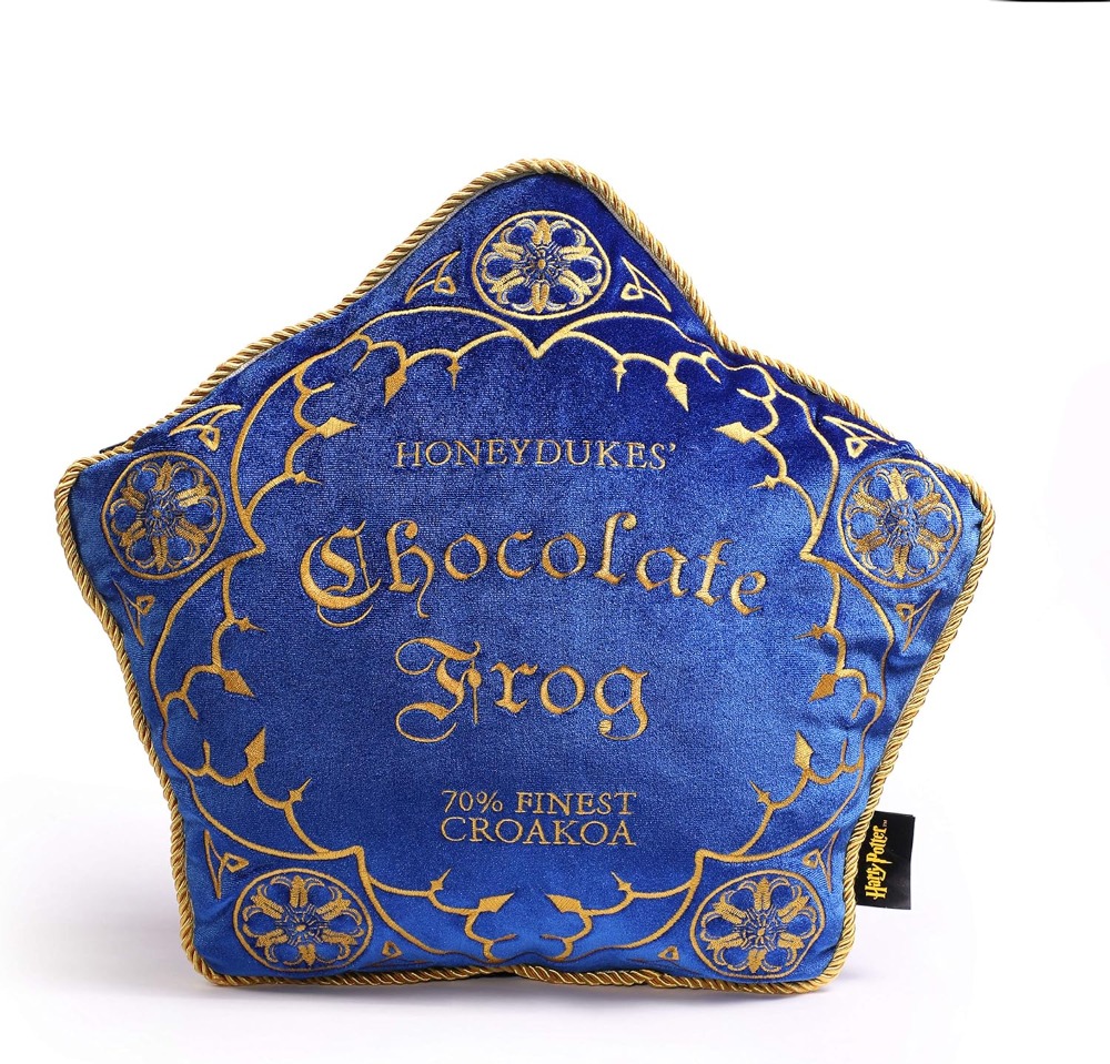 Une version peluche de la Grenouille en Chocolat, apparue pour la première fois dans Harry Potter à l'école des sorciers (2001), accompagnée d’un coussin en velours bleu marqué de l’enseigne Honeydukes. Orné de broderies dorées détaillées et doté d’une fermeture éclair dissimulant un intérieur doux et soyeux, ce coussin peut servir à ranger la peluche de la grenouille à l’intérieur ou être utilisé comme coussin décoratif.
