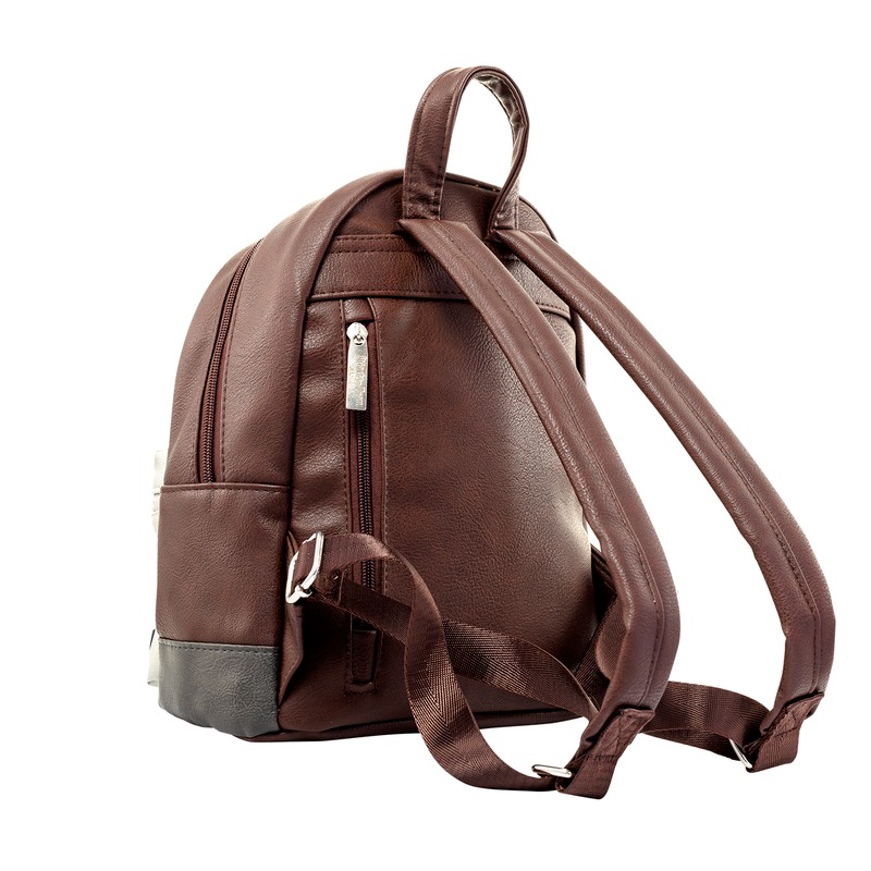 Il est fabriqué en PU avec des poches à l’intérieur et à l’extérieur, entièrement doublé en nylon. Il possède un pendentif sur un côté, ainsi que des détails métalliques et embossés.